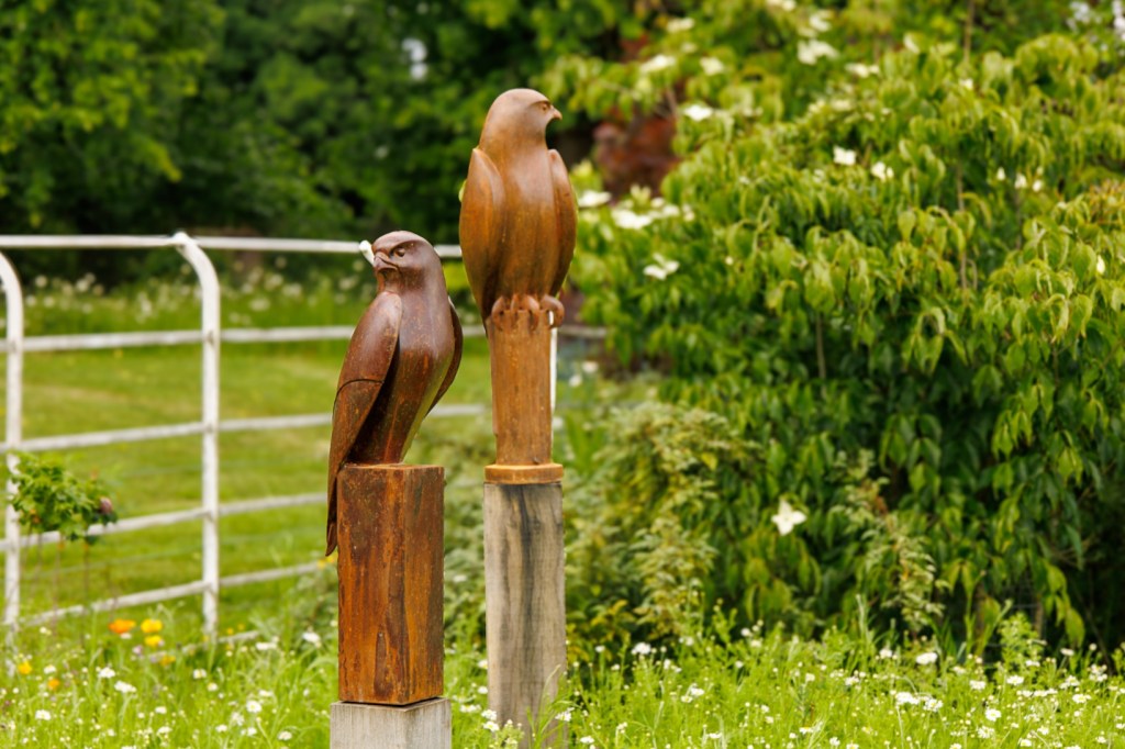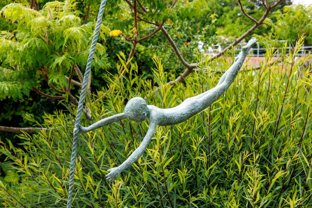 Visitors can wander through the lush sculpture gardens, where outdoor pieces by renowned artists such as Dawn Benson and Judy Boyt are carefully placed amidst the greenery, creating a harmonious blend of art and nature.